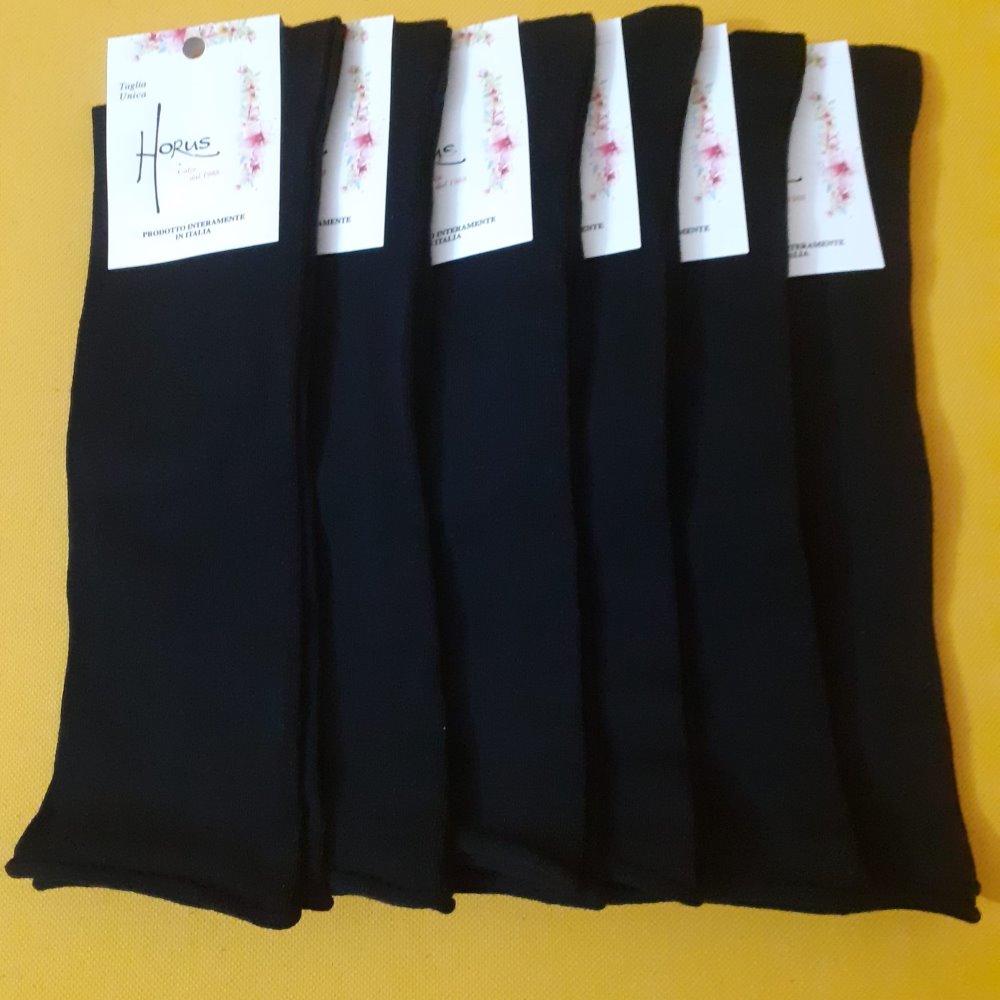 6 Paia di calzini lunghi, da donna, con bordo smollato, in cotone caldo elasticizzati, originali e nuovi di fabbrica. Taglia unica: 36-41. Colori disponibili: neri e assortiti. Composizione del prodotto: 95%cotone e 5%elastan. Marca: “Horus”. Codice: 601. Made in Italy.