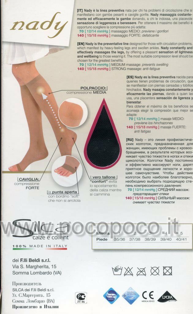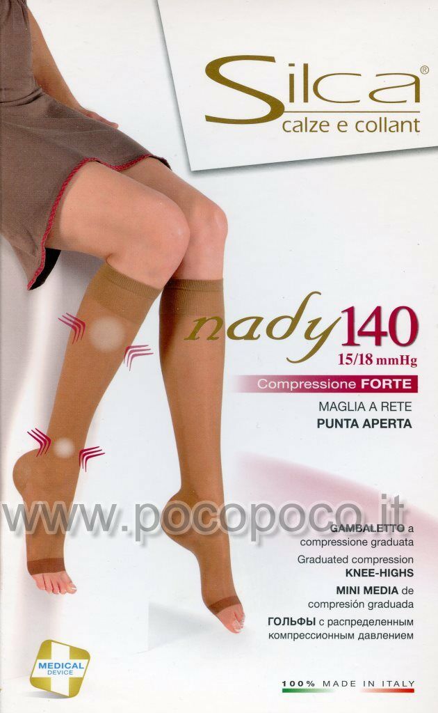 1 Paio di gambaletti riposanti 140 den, con punta aperta, maglia a rete, a compressione graduata forte mmHg 15/18, compressione media sul polpaccio, compressione forte sulla caviglia, tallone confort che evita lo spostamento della calza mentre si cammina e punta aperta con bordino “soft” che non si arrotola, originali e nuovi di fabbrica; linea Nady 140: nata per chi ha problemi di circolazione che si manifestano con gambe pesanti e caviglie gonfie, Nady massaggia costantemente ed efficacemente le gambe donando, a chi le indossa, una piacevole sensazione di leggerezza e benessere, mmHg 15/18 massaggio FORTE: defaticante. Colori disponibili: nero, playa e visone. Taglie disponibili: 2 (piede 37/38), 3 (piede 38/39), 4 (piede 39/40) e 5 (piede 40/41). Composizione del prodotto: 79%poliammide e 21%elastan. Marca: “Silca”. Codice: 3185.