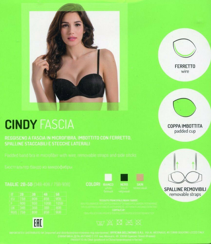 Reggiseno fascia coppa imbottita, con ferretto, con spalline removibili e intercambiabili trasparenti, stecca laterale, in microfibra, coppa B, linea Basic, originale e nuovo di fabbrica. Colori disponibili: bianco, skin e nero. Taglie disponibili: 2, 3, 4 e 5. Composizione del prodotto: 90%poliammide e 10%elastan (tessuto principale), 100%poliestere (coppa). Marca: “Love and Bra”. Codice: Cindy.