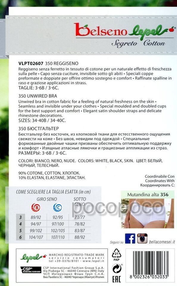 Reggiseno non imbottito senza ferretto, in tessuto di cotone per un naturale effetto di freschezza sulla pelle, senza cuciture, invisibile sotto gli abiti, speciali coppe preformate e doppiate per offrire ottimo sostegno e comfort, raffinate spalline in raso e graziose applicazioni in strass, coppa C, linea Belseno Segreto Cotton. Colori disponibili: bianco, nudo e nero. Taglie disponibili: 3, 4, 5 e 6. Composizione del prodotto: 90%cotone, 10%elastan. Marca: “Lepel”. Codice: 350.