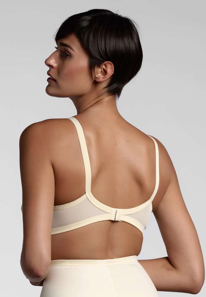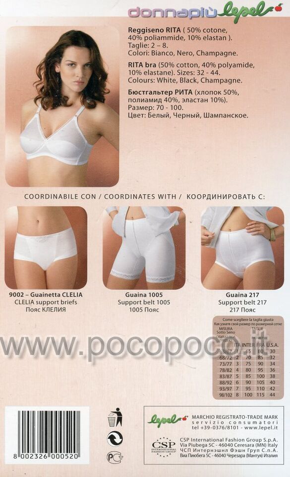 Reggiseno senza imbottitura e senza ferretto, coppe in 100% cotone, motivo incrociato sul davanti, sostegno e massimo comfort, coppa B, linea Donna più. Colori disponibili: bianco, champagne e nero. Taglie disponibili: 3, 4, 5, 6, 7 e 8. Composizione del prodotto: 50%cotone, 40%poliammide e 10%elastam. Marca: “Lepel”. Codice: Rita.
