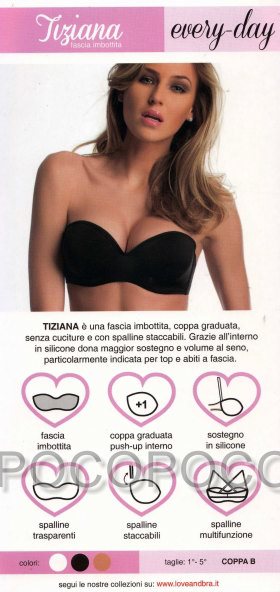 Reggiseno fascia imbottita, realizzata in microfibra, con ferretto, coppa graduata push up interno, senza cuciture, sostegno in silicone, spalline staccabili e multifunzione, in omaggio le spalline trasparenti, coppa B, grazie all’ interno in silicone dona maggior sostegno e volume al seno, particolarmente indicato per top e abiti a fascia, originale e nuovo di fabbrica. Colori disponibili: bianco, nero e skin. Taglie disponibili: 1, 2, 3, 4 e 5. Composizione del prodotto: 85%poliammide e 15%elastan. Marca: “Love and Bra”. Codice: Tiziana.